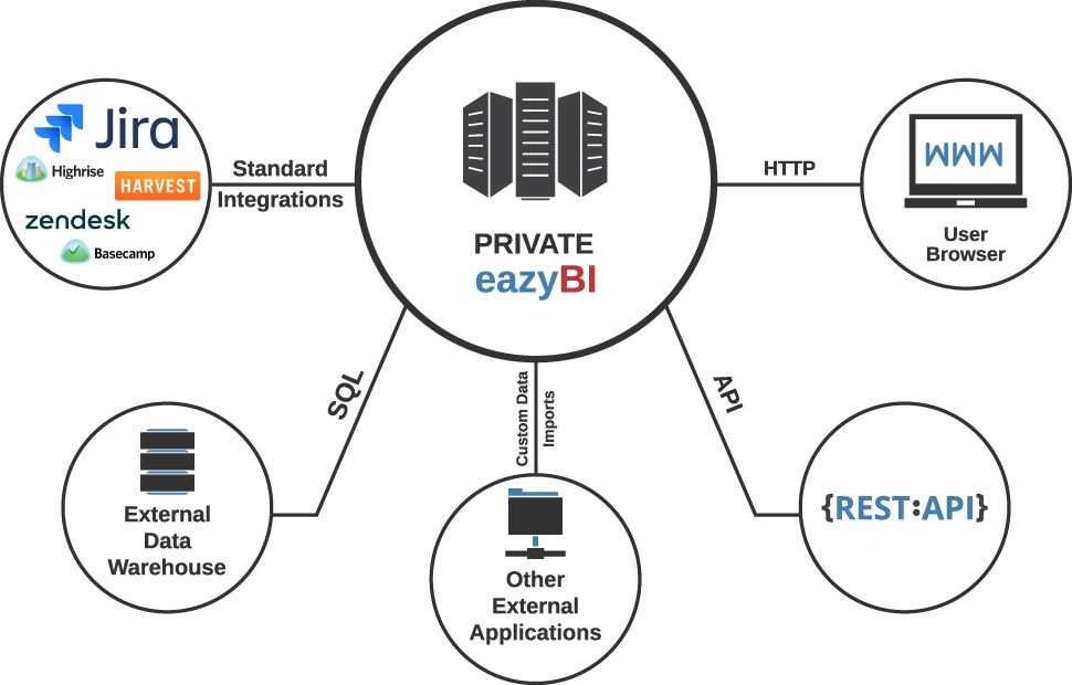 Private eazyBI is easy to install and easy to upgrade. Customize its visual appearance by adding your logo, headers, footers, colors etc. Private eazyBI also allows you to develop additional integrations with other applications.