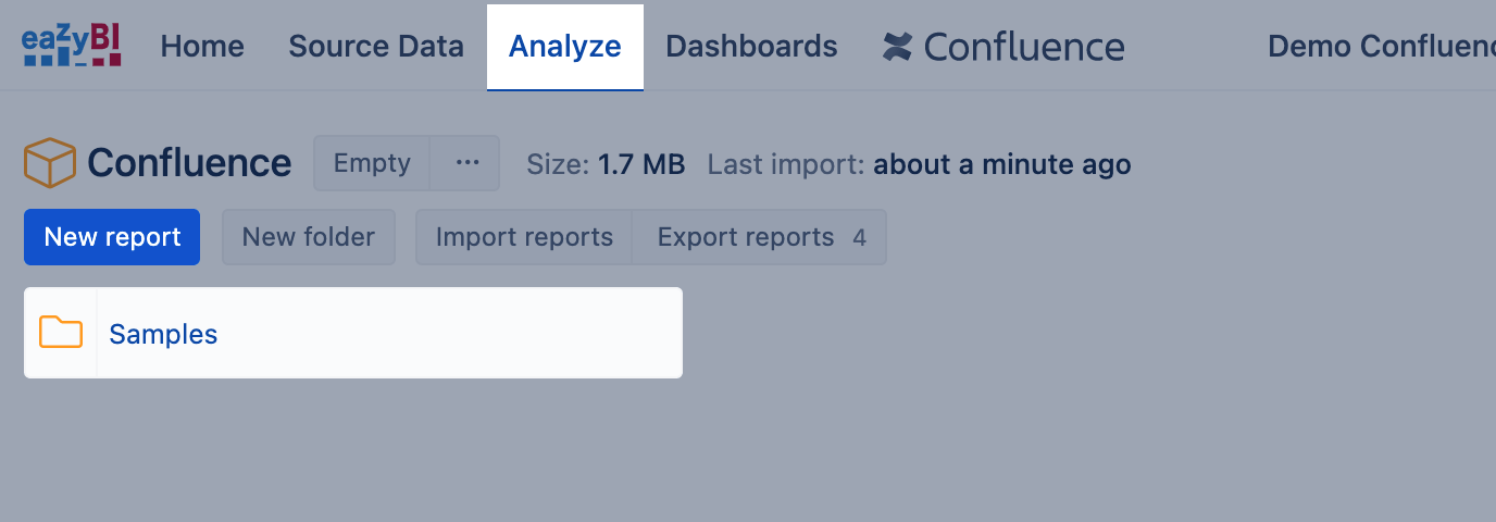 After importing data from Confluence, go to tab Analyze and start to explore data by looking through Sample reports or creating New report. It would be essential to understand the report building blocks, measures, and dimensions, before you start creating eazyBI reports. Use AI assistants to get started.