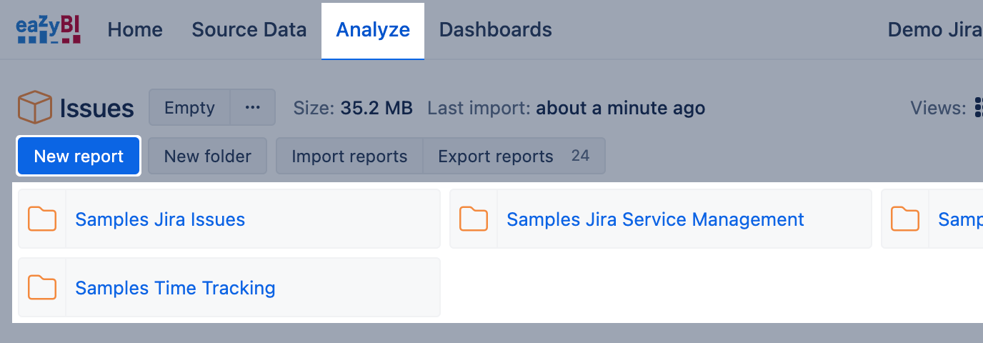 After importing data from Jira, go to tab Analyze and start to explore data by looking through Sample reports or creating New report. It would be essential to understand the report building blocks, measures, and dimensions, before you start creating eazyBI reports. Use AI assistants to get started.